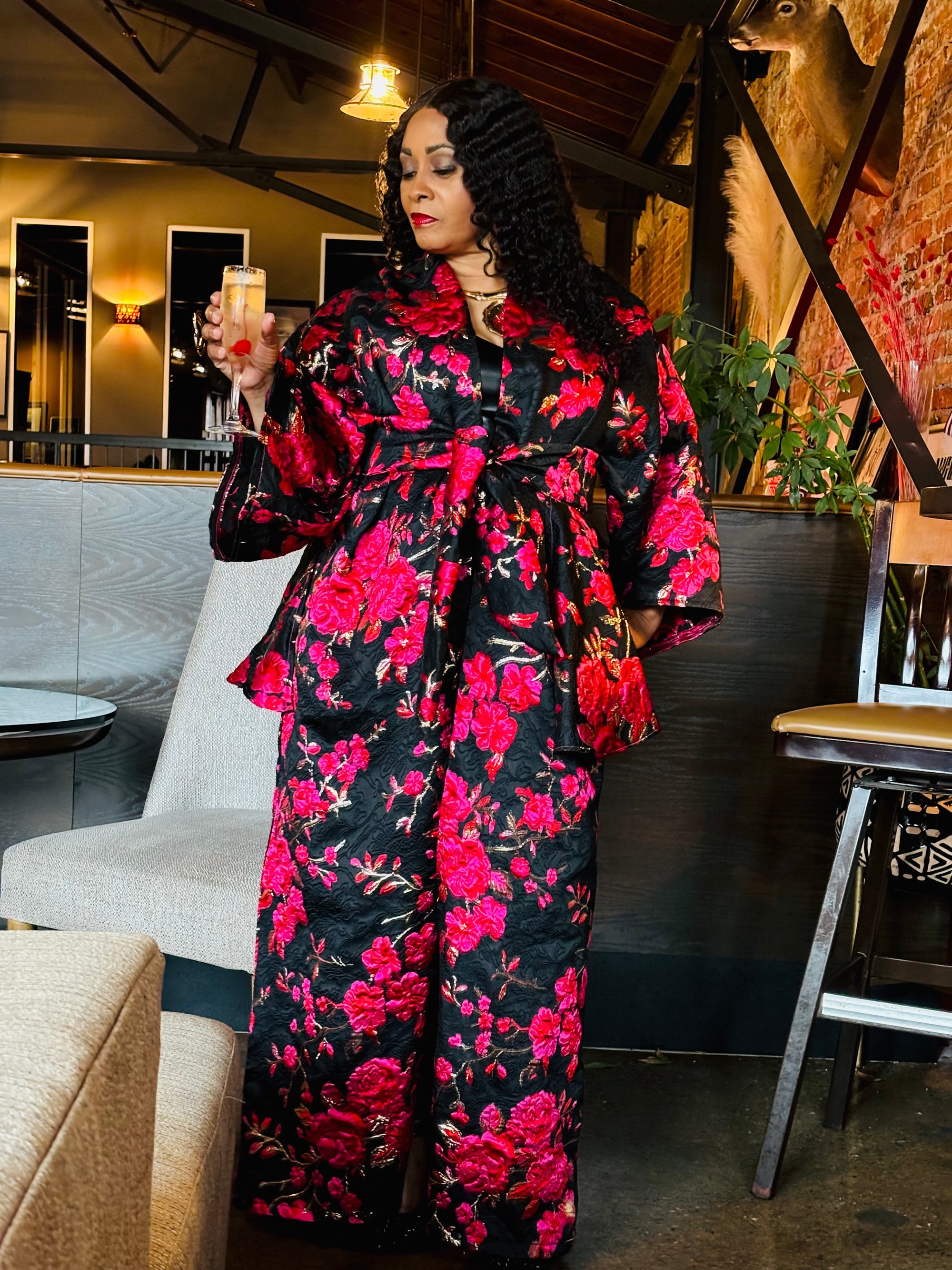 Full length kimono jacket with peplum belt. Beautiful brocade fabric. Fully lined